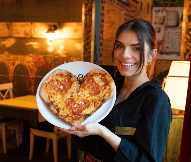 Miłość może mieć różne kształty… nawet jak pizza w formie serca! Choć ta ze zdjęcia powstała tylko na potrzeby sesji zdjęciowej, to klimat i smak w naszej restauracji są jak najbardziej prawdziwe – i warte